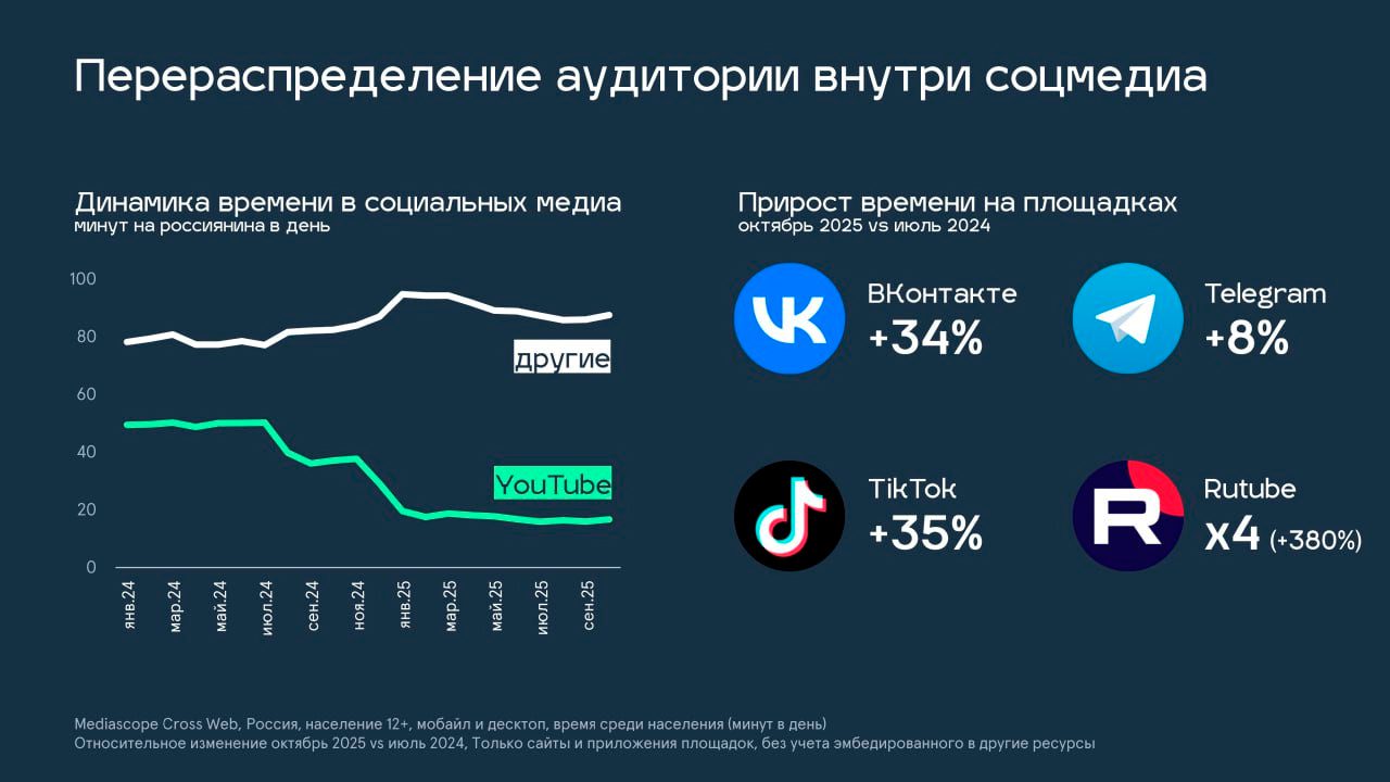 Снижение времени в YouTube повлияло на перераспределение аудитории внутри других социальных медиа: за этот же период время пользователей во «ВКонтакте» увеличилось на 34%, в Telegram – на 8%, в TikTok на 35%, Rutube – в четыре раза (на 380%).