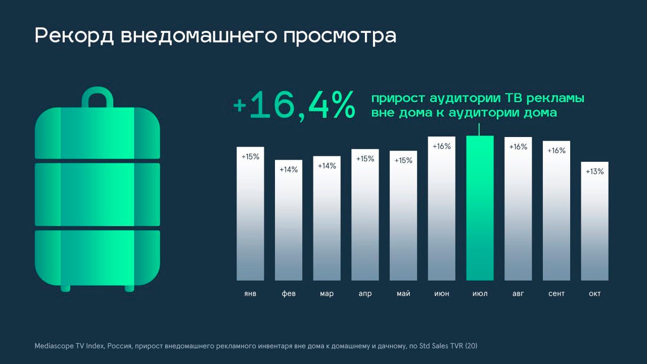 Июль – традиционный период отпусков и поездок по стране. Именно в этом месяце был зафиксирован самый высокий прирост внедомашнего телесмотрения: +16,4%.