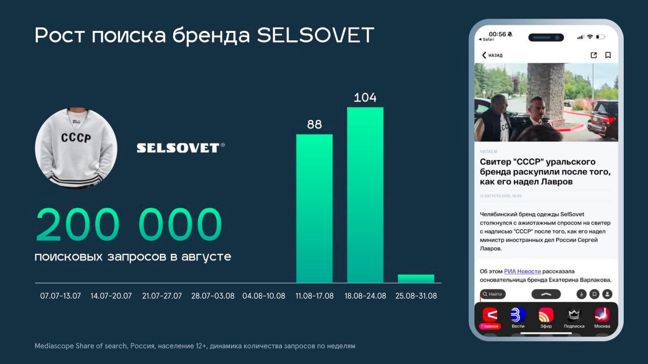 В августе случился резкий скачок в количестве упоминаний одного из брендов: 15 августа министр иностранных дел РФ Сергей Лавров появился на саммите на Аляске в свитере с надписью СССР. Сразу же после этого события россияне массово начали искать челябинский бренд SelSovet, который произвёл этот свитер – в августе Mediascope зафиксировал 200 тысяч пользовательских запросов с упоминанием этого бренда.