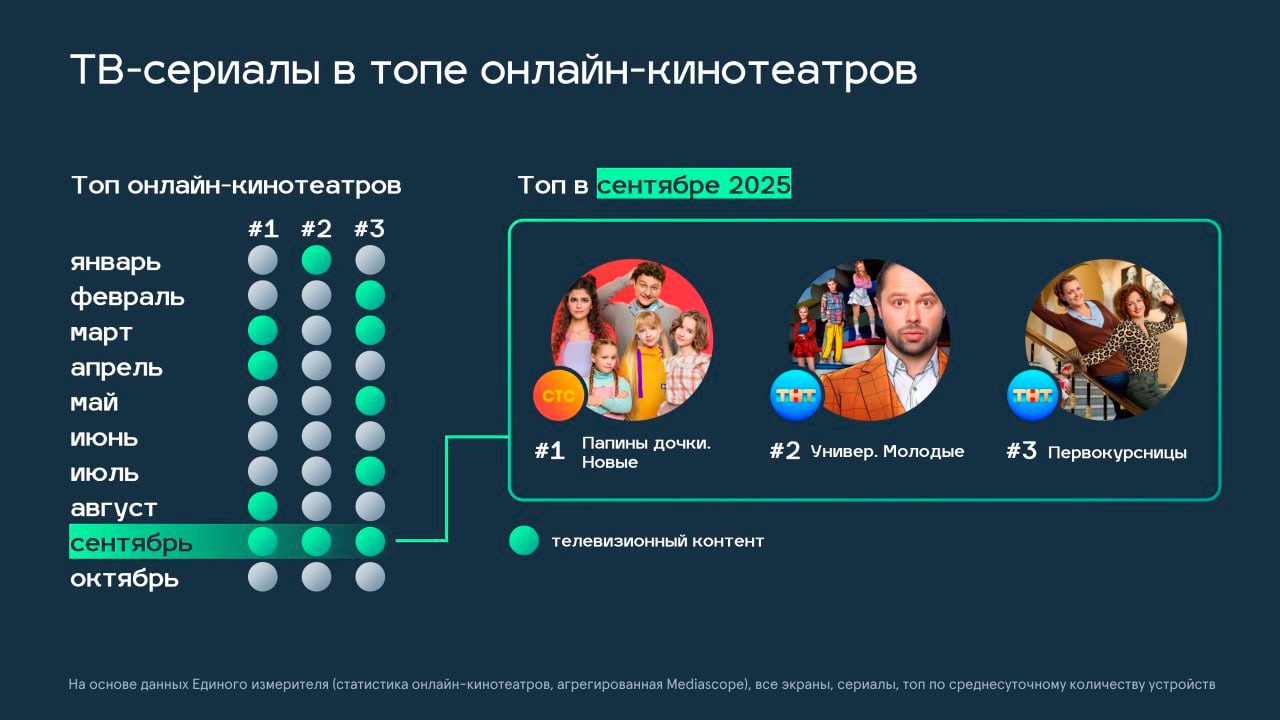 Телевизионный контент пользуется успехом и в онлайн-кинотеатрах. Так, в сентябре весь топ-3 в онлайн-кинотеатрах заняли ТВ-проекты «Папины дочки. Новые», «Универ.Молодые», «Первокурсницы».