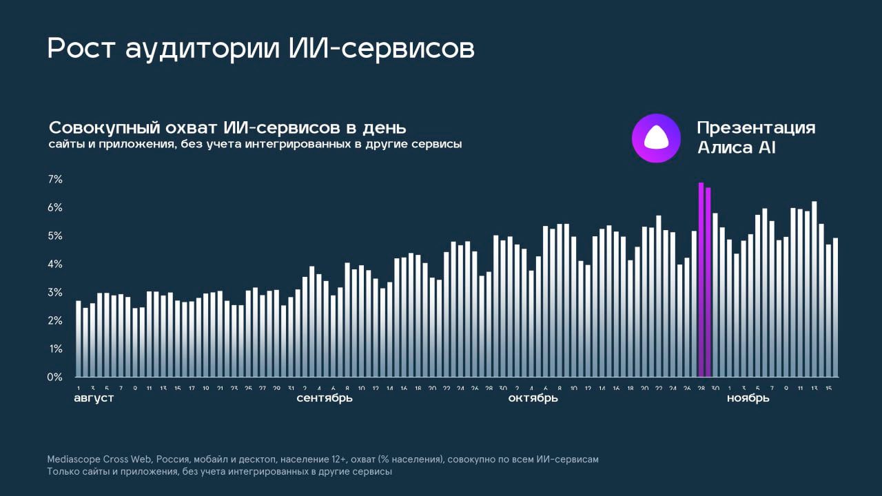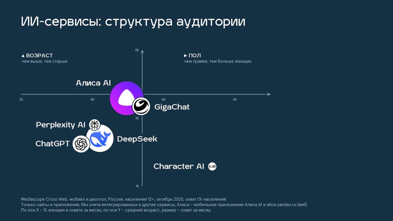 Самые популярные ИИ-сервисы у россиян по охвату за октябрь: Алиса AI (14%), DeepSeek (9%), GigaChat (4%), ChatGPT (4%), Perplexity AI (1%), Сharacter.ai (1%).