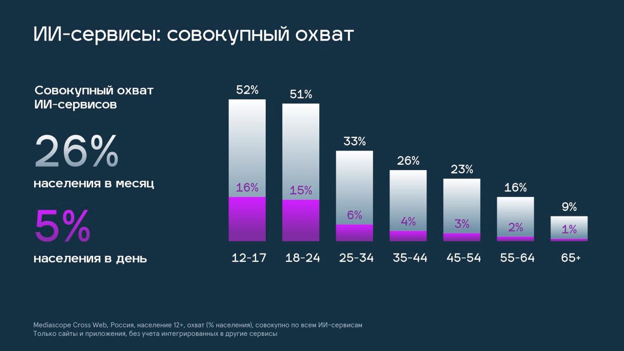 В последнее время Mediascope наблюдает активный рост числа пользователей ИИ-сервисов: 26% россиян старше 12 лет хотя бы раз в месяц используют какой-либо ИИ-сервис, среднесуточная аудитория этих ресурсов – 5%. Выше всего совокупный охват ИИ в молодых группах: больше половины россиян 12-24 лет используют такие сервисы.