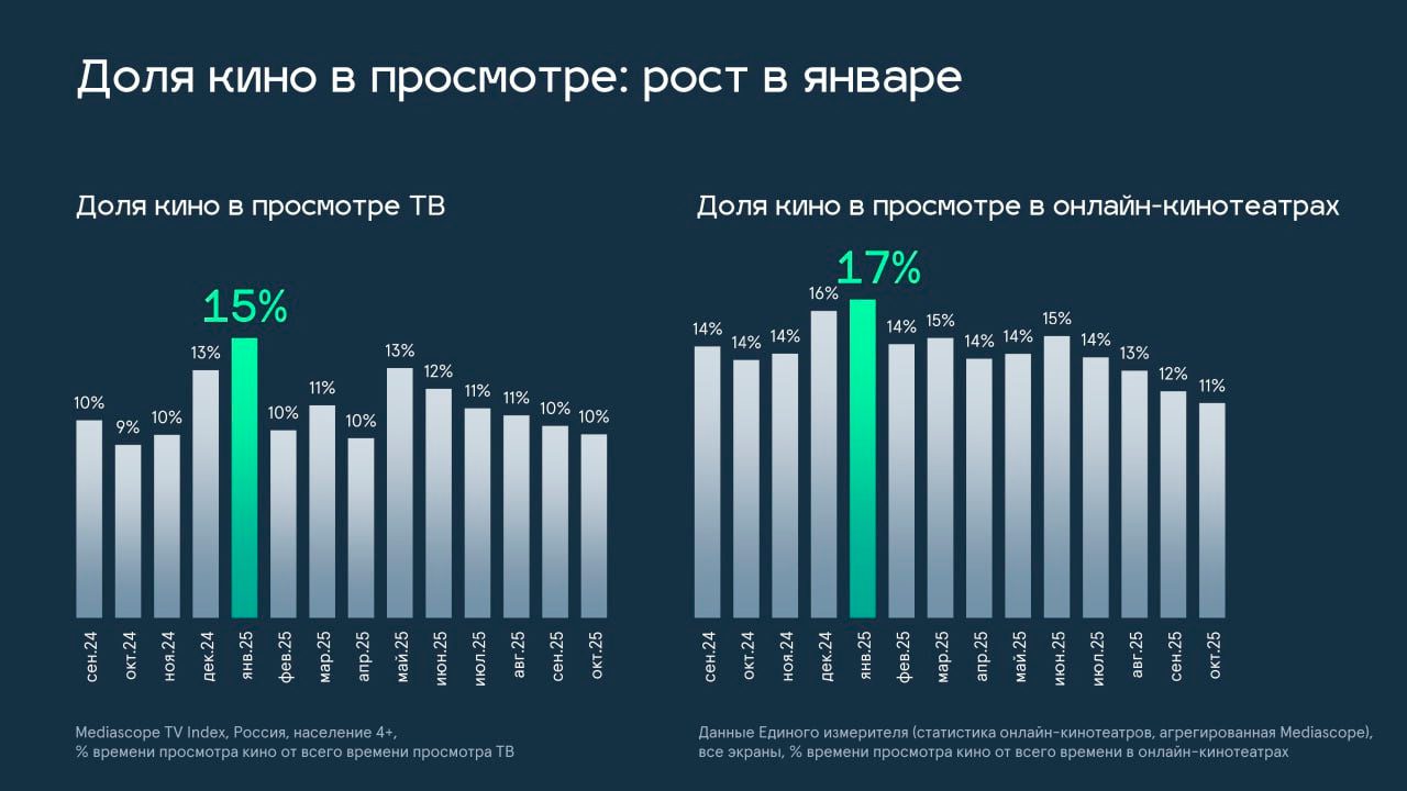 Традиционно январь – месяц пикового интереса к кино: в январе 2025 доля кино в просмотре ТВ составила 15%, а в просмотре онлайн-кинотеатров – 17%.