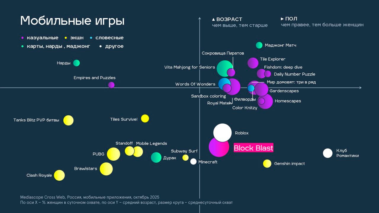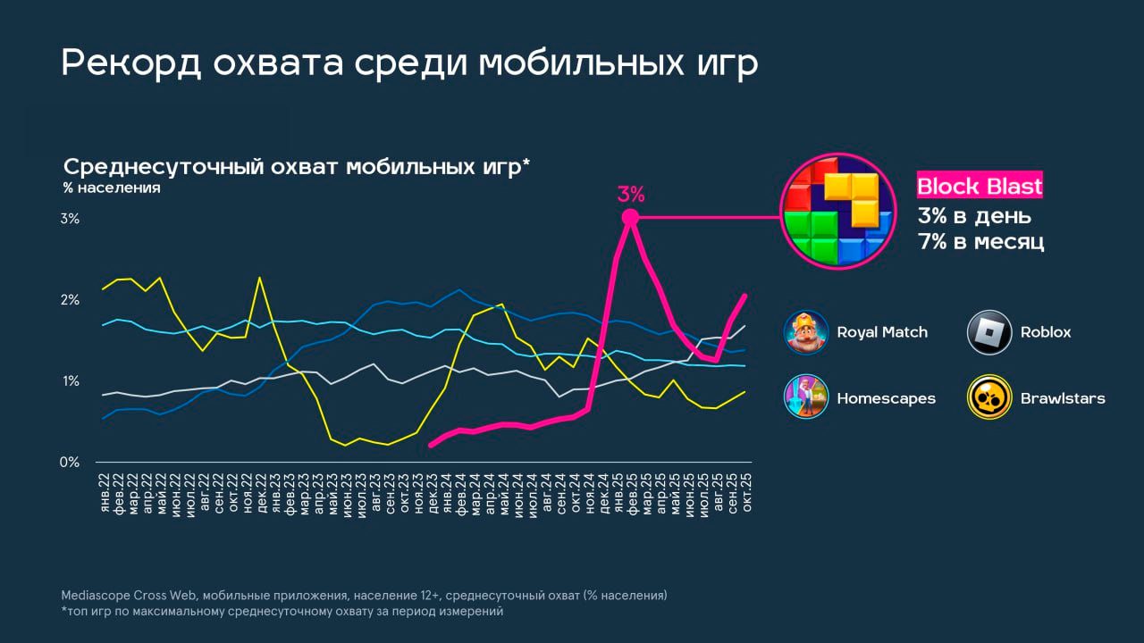 Игра Block Blast достигла охвата в 3% в сутки и 7% в месяц среди мобильных пользователей – это рекорд за все время измерений Mediascope. Резкий рост аудитории игры был обусловлен, в первую очередь, высоким интересом молодой аудитории.