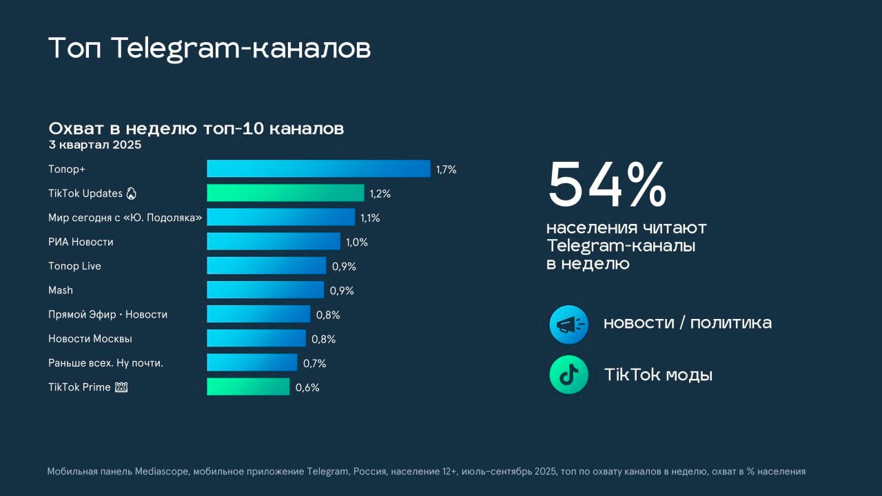На свои традиционные места в топах площадки вернулись новостные каналы и новые лидеры: по итогам третьего квартала в топ-10 Telegram-каналов вошли восемь ресурсов, посвящённых новостям и политике, и два канала, посвящённых модификации TikTok.