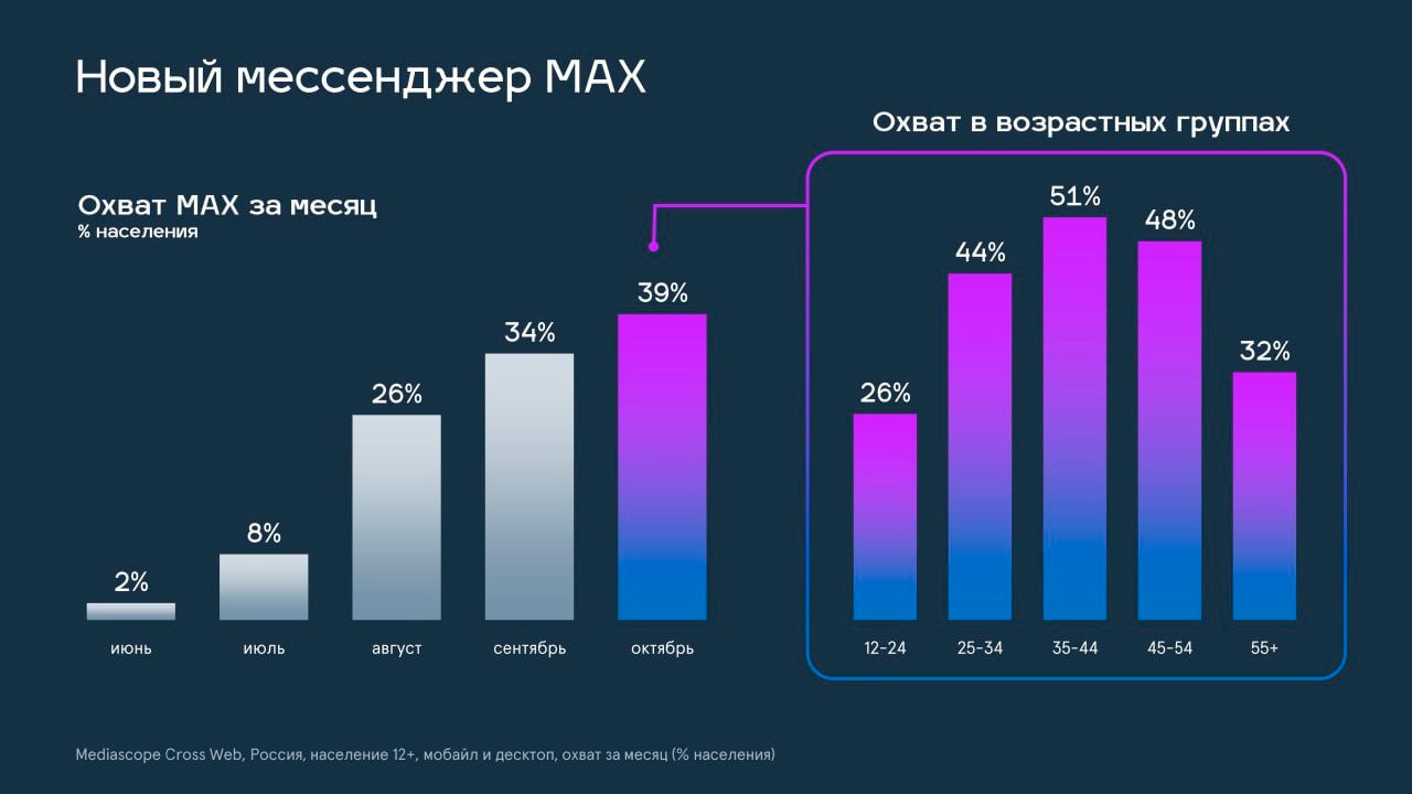 Наибольший охват Max демонстрирует в средних возрастных группах – 51% в 35-44 года, 48% – в 45-54 и 44% – в 25-34.