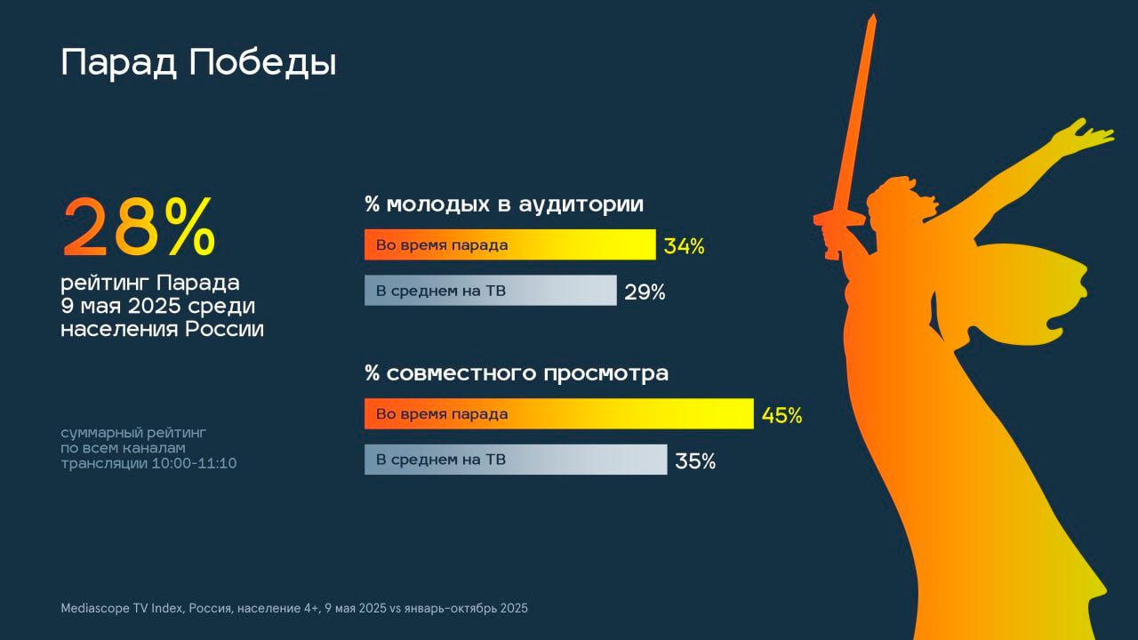Во время трансляции парада было зафиксировано увеличение доли молодых зрителей (34% против 29% в среднем на ТВ); доля совместного просмотра во время трансляции Парада 9 мая 2025 года достигла 45%, тогда как в среднем на ТВ она составляет 35%.
