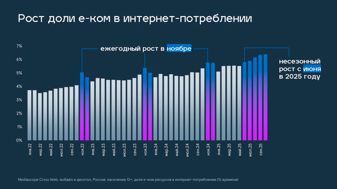 В июне 2025 года Mediascope заметил неожиданный для этого сезона рост времени потребления в сегменте «электронная коммерция» (традиционно пик пользовательской активности на маркетплейсах приходится на ноябрь). А июньский прирост был обусловлен действиями одного из игроков рынка.