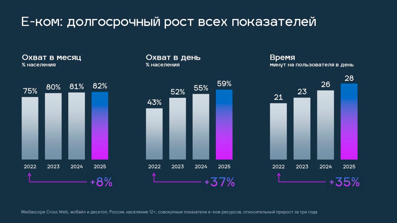 С 2022 года среднемесячный охват e-com вырос на 8%, среднесуточный – на 37%, а время на пользователя – на 35% и сейчас составляет 28 минут в сутки. Особенно активно растет использование e-com в средней и старшей возрастных группах.