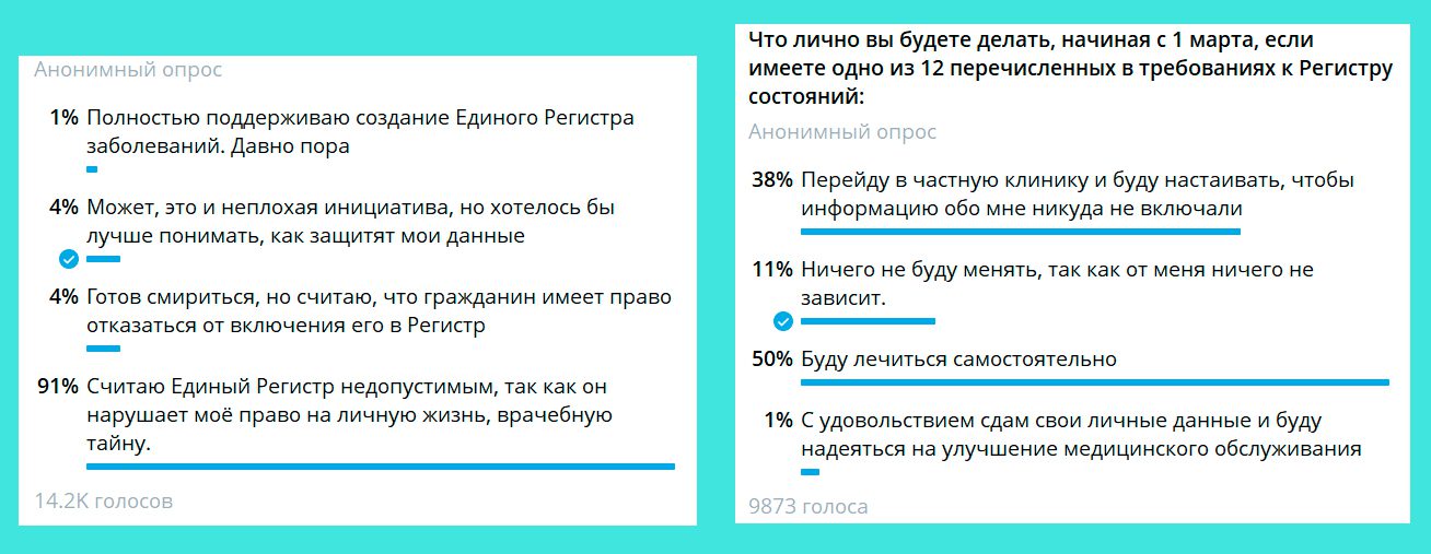 Они указали, что единый регистр недопустим, так как «он нарушает право на личную жизнь, врачебную тайну». Ещё 4% признали, что готовы смириться, но при этом должны быть предусмотрены инструменты для отказа от обработки данных. Столько же опрошенных хотели бы лучше понимать, как эти данные будут защищены. Полностью поддерживают идею создания регистра 1% проголосовавших.