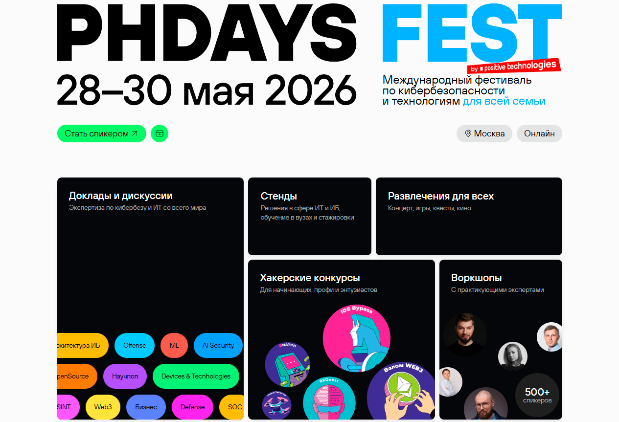 Международный фестиваль по кибербезопасности и технологиям Positive Hack Days пройдёт в Москве (онлайн и офлайн) 28-30 мая.