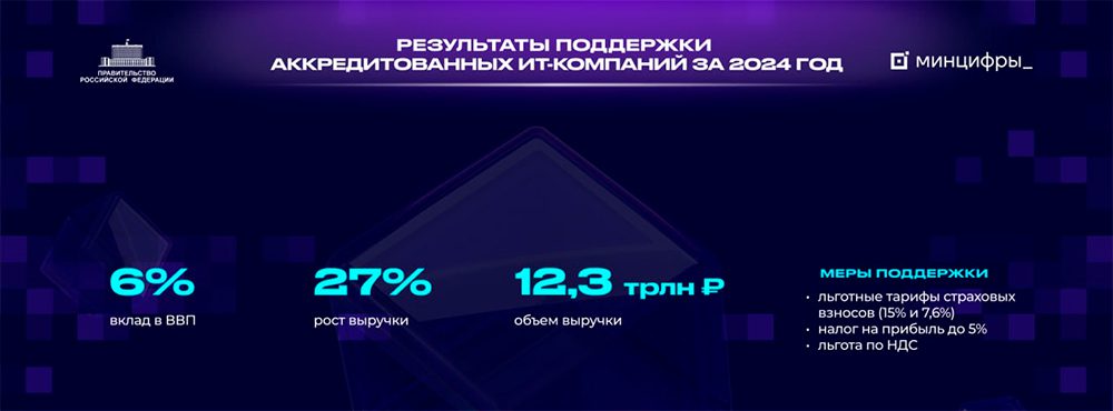 Говоря о мерах поддержки отрасли, Мишустин отметил, что они «дали ощутимые результаты». Только в прошлом году вклад аккредитованных компаний в ВВП страны составил почти 6%, а их выручка увеличилась на 27%, достигнув 12 триллионов рублей.