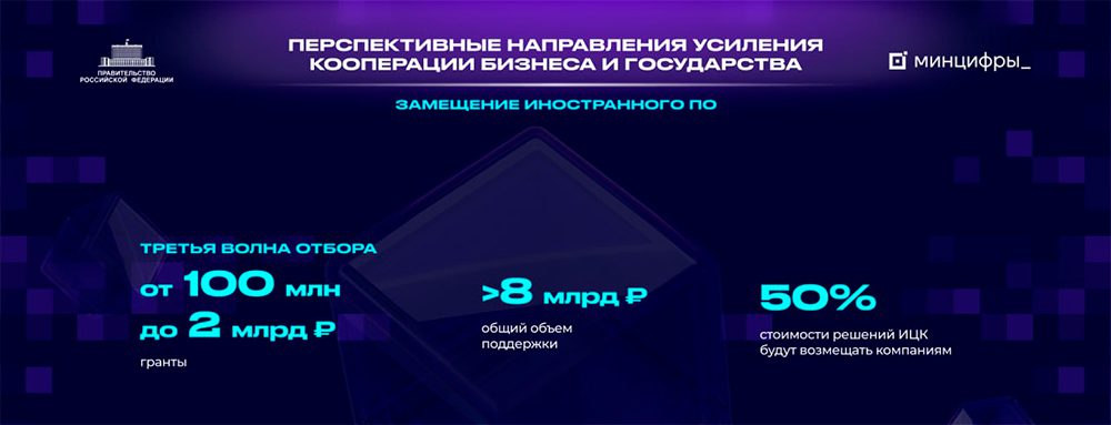 Следующее направление – это дальнейший курс на замещение иностранного программного обеспечения. За последние три года объём продаж российского базового общесистемного ПО вырос в два раза. Растёт конкуренция внутри рынка, он пополняется и новыми участниками. Продукты уже вышли на уровень производительности, который соответствует требованиям самых больших корпораций. Выпускаются специализированные версии для конкретных отраслей.