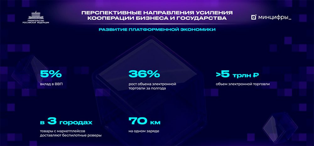 Во-первых, это дальнейшее развитие платформенной экономики. Сегодня она, по данным Высшей школы экономики, обеспечивает около 5% валового внутреннего продукта России. Открывает новые возможности для граждан и бизнеса. С октября 2026 года вступит в силу закон о платформенной экономике.