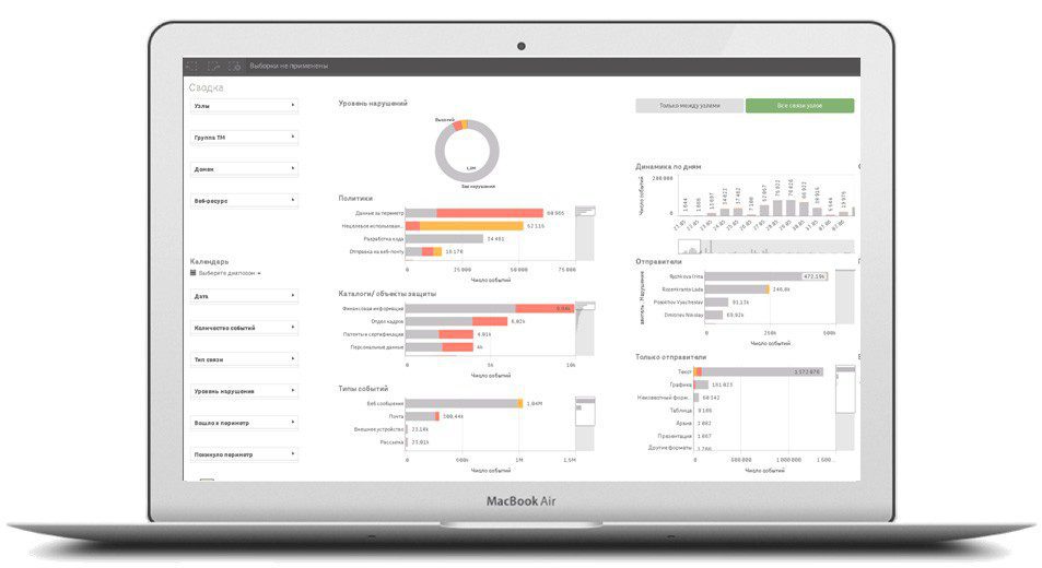 Программный продукт предоставляет ИБ-специалисту инструменты для визуального анализа информационных потоков компаниии направлен на выявление инцидентов в области ИБ, в том числе —не являющихся нарушениями с точки зрения политик безопасности в организации. Решение также призвано помогать ИБ-специалисту в принятии решений в ходе расследований, предоставляя на основе всей хранимой информации о событиях ИБ дополнительные релевантные данные по предложенным запросам.