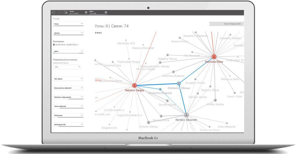 Граф связей предназначен для анализа информационных потоков, возникающих внутри организации и при взаимодействии с внешними контрагентами. Благодаря интерактивным механизмам решение позволяет в режиме реального времени визуально представить информационные потоки, генерируемые сотрудниками, в различных аспектах ИБ.