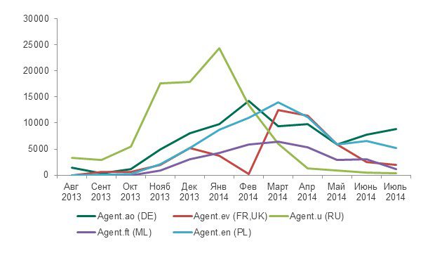 Небольшой рост количества атак в Германии в конце периода показала также вредоносная программа Agent.ao, распространяемая партнерской программой, ориентированной преимущественно на эту страну.