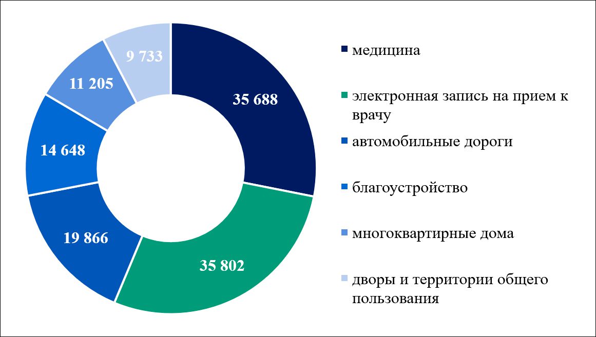 Основное количество обращений в 2025 году поступило по категориям «Электронная запись на приём к врачу» (35 802 обращений), «Медицина» (35 688 обращений), «Автомобильные дороги» (19 866 обращений), «Благоустройство» (14 648 обращений), «Многоквартирные дома» (11 205 обращений), «Прямая линия» (10 177 обращений), «Дворы и территории общего пользования» (9733 обращений) и другие.