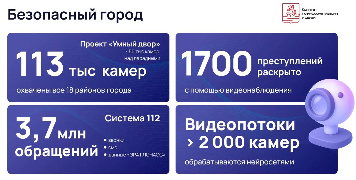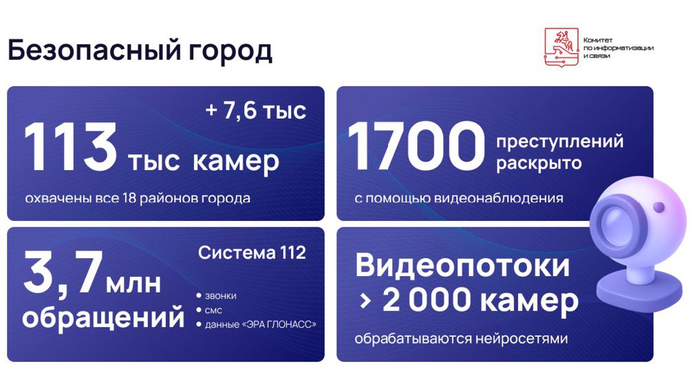 Приоритетным направлением развития остаётся обеспечение личной безопасности граждан и контроль за общественным порядком во дворах, кварталах и парадных. Сейчас системой охвачен весь город – работает более 113 тысяч городских камер видеонаблюдения.