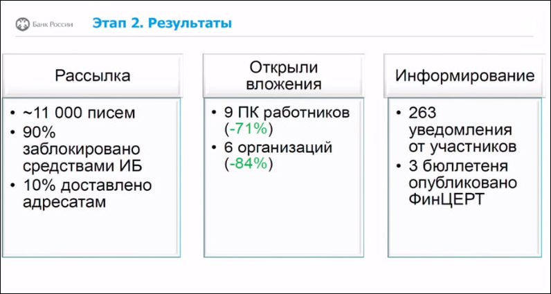 Банк России в 2023 году провел киберучения, в которых участвовали свыше 350 финансовых организаций (банки, страховщики, участники рынка ценных бумаг), сообщил глава департамента информационной безопасности Банка России Вадим Уваров. Больше 40 человек из 37 организаций (10% участвующих компаний) открыли «фишинговое» письмо на первом этапе эксперимента, скачали и установили приложение. По мнению ЦБ, этот инструмент достаточно эффективный с точки зрения взаимодействия с отраслью и «подсветки рисковых событий».
