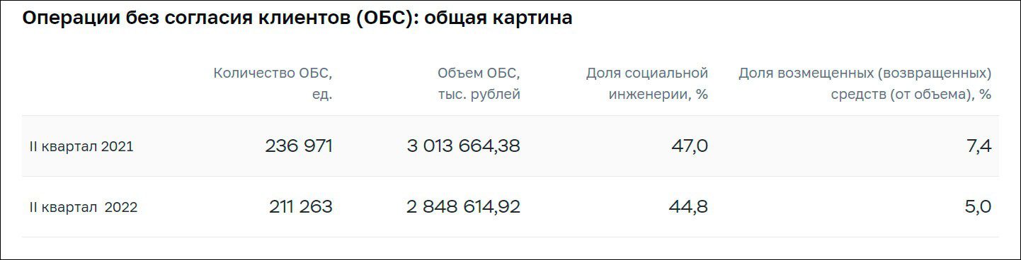 Количество случаев хищения денежных средств во втором квартале 2022 года снизилось по сравнению с аналогичным периодом прошлого года на 10,8%, до 211,2 тысячи, общий размер ущерба, нанесенный злоумышленниками, сократился на 5,5%, до 2,8 миллиарда рублей, следует из «Обзора отчетности об инцидентах информационной безопасности при переводе денежных средств» за второй квартал 2022, опубликованного Банком России в четверг.
