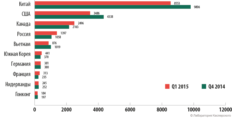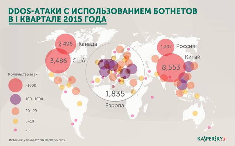 В первом квартале 2015 года было зафиксировано 23 095 DDoS-атак с использованием ботнетов, что на 11% меньше, чем в предыдущем квартале (25 929 атак). В России же число таких атак выросло с 1058 в четвертом квартале 2014 года до 1397 в первом квартале 2015 года, сообщает «Лаборатория Касперского».