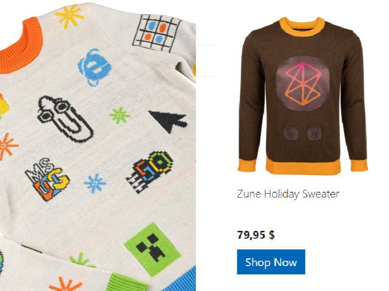 Потенциальным покупателям предлагается отпраздновать Рождество в свитерах Artifact, Zune, Xbox. На белом свитере Artifact, например, размещены иконки MS-DOS, Minesweeper, Internet Explorer Microsoft 3.1 Paintbrush, Windows 3.1 Notepad и другие.