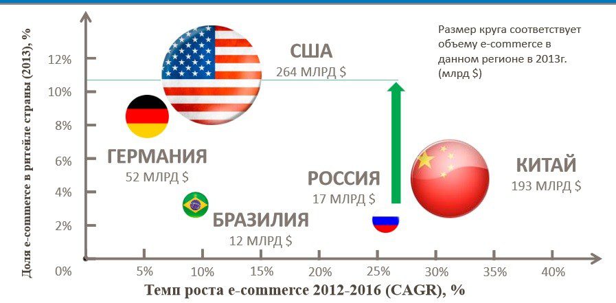 Крупнейшая составляющая интернет-экономики – электронная коммерция. По данным Ассоциации компаний интернет-торговли (АКИТ), объем е-коммерции в 2013 году в России составил 17 миллиардов долларов. Для сравнения, в Германии – в три раза больше – 52 миллиарда, в Китае – 193 миллиарда, в США – 264 миллиарда.