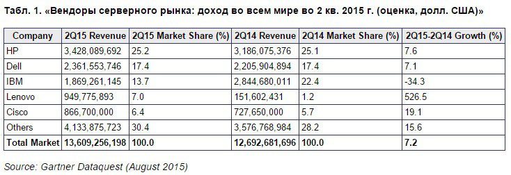 HP сохранила свое положение вендора № 1 на мировом серверном рынке с долей рынка 25,2% по доходу (см. Табл. 1). Lenovo имела самый значительный рост дохода во втором квартале — на 526,5%. Все вендоры в первой пятерке, кроме IBM, показали рост дохода.