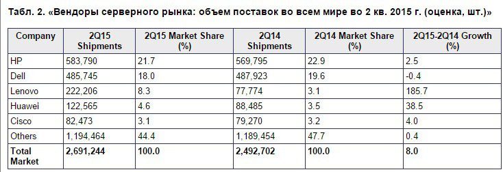 По объему поставок серверов HP оставалась мировым лидером во втором квартале (см. Табл. 2) с ростом поставок на 2,5% за год. Доля компании в мировом объеме поставок составила 21,7%, что представляет собой снижение на 1,2% по сравнению с тем же кварталом 2014 года.