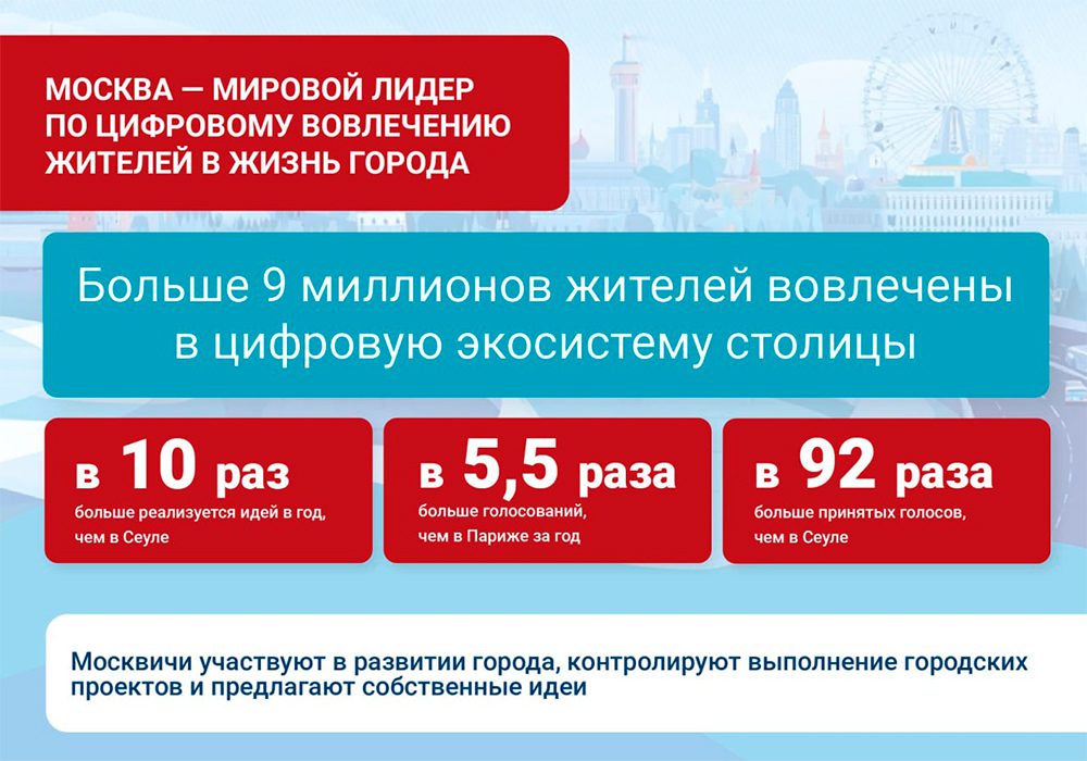 Для сравнения, другие мегаполисы мира привлекают в подобные проекты не больше миллиона человек. По активности пользователей Москва опережает признанных лидеров – Сеул и Париж, утверждает Собянин.