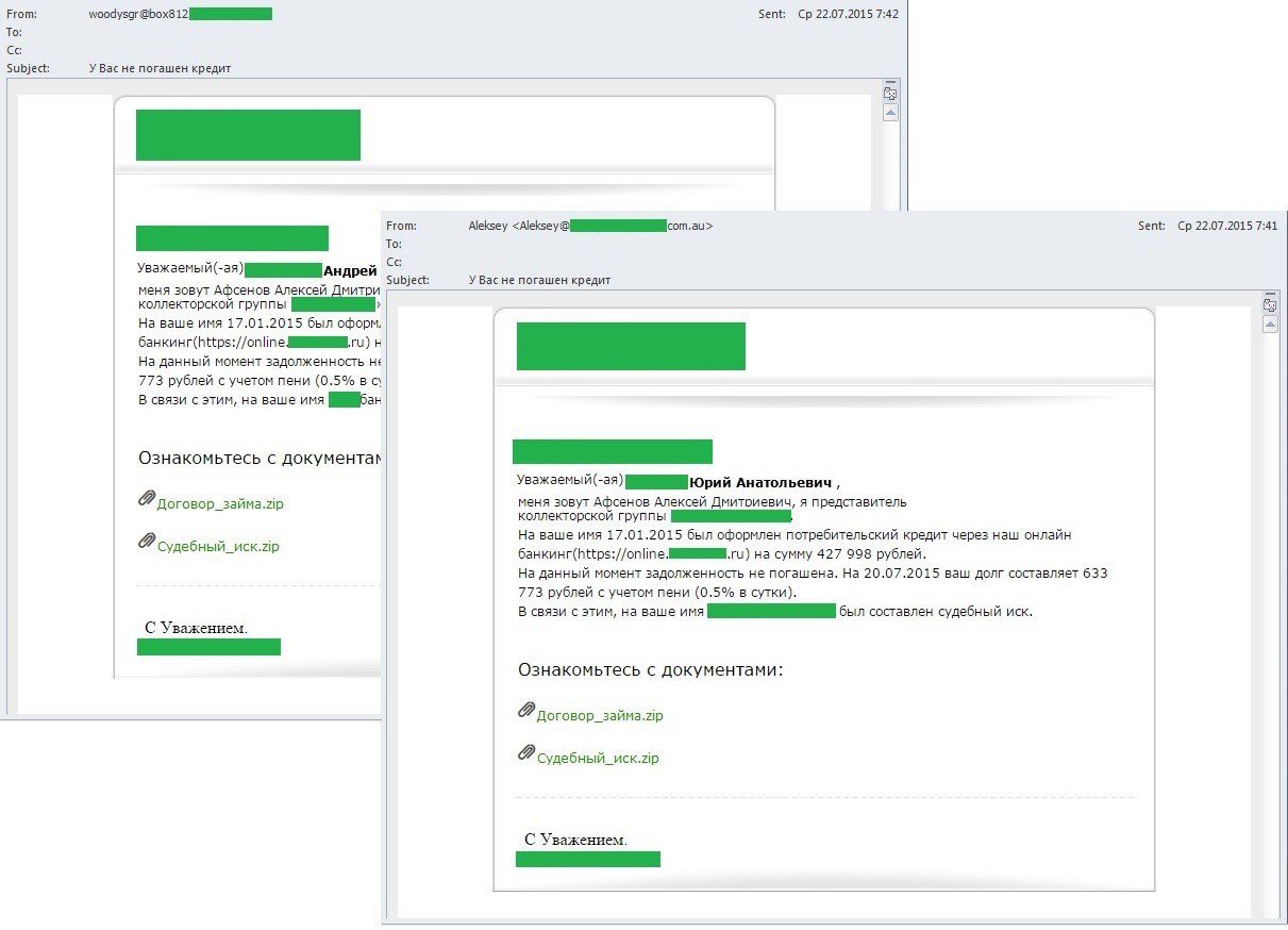Массовая вредоносная рассылка писем, которые были оформлены как уведомления от крупного российского банка, была обнаружена в конце июля. Сообщения отправлялись от имени сотрудника финансовой организации, который извещал получателя о том, что ранее на его имя через сервис онлайн-банкинга был оформлен кредит на крупную сумму — и в настоящее время по этому кредиту образовалась большая просроченная задолженность. Далее «представитель банка» запугивал пользователя тем, что в отношении него уже составлен судебный иск, и предлагал ознакомиться со всеми подробностями в приложенных к письму документах, сообщает «Лаборатория Касперского».
