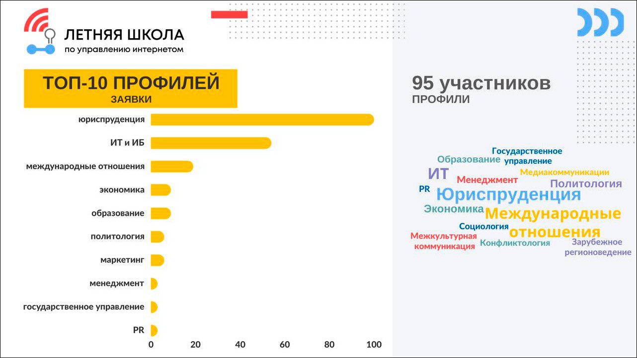 Заявки на участие в Летней школе по управлению интернетом поступили из 10 стран: Армении, Беларуси, Индии, Казахстана, Китая, Кыргызстана, России, Таджикистана, Туркменистана и Узбекистана. Особенно много заявок было от молодых специалистов, уже окончивших вузы и работающих в различных профессиональных сферах.