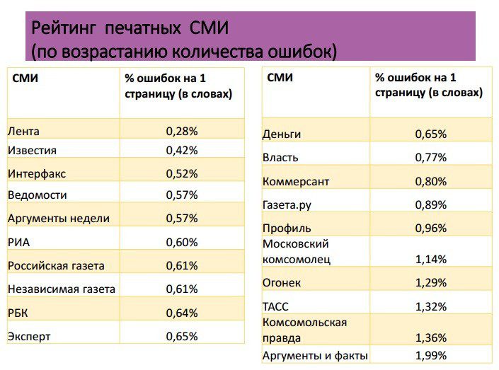 Среди печатных и онлайн-СМИ лучшими с точки зрения минимума орфографических ошибок и ошибок несогласования (неверные окончания в словах) признаны «Лента» и «Известия» (одна ошибка на три страницы; однако описания «страницы» Экспертный центр электронного государства в презентации не нашел).