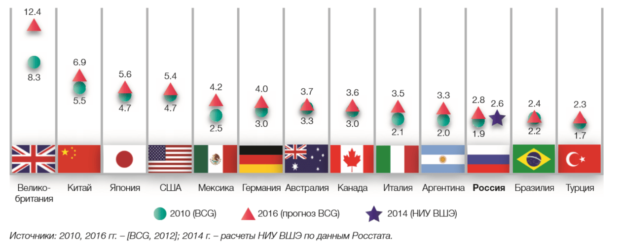 Кроме того, в исследовании указывается, что по уровню развития интернет-экономики наша страна опережает Бразилию (2,4%) и Турцию (2,3%) и приближается к Аргентине (3,3%). Отставание от лидера – Великобритании (12,4%) составляет 4,8 раза.