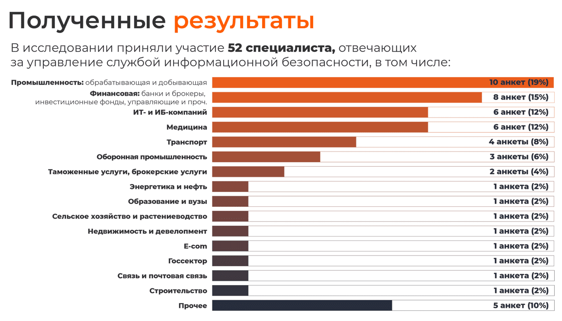 В опросе принимали участие как небольшие (больше половины опрошенных), так и крупные компании, представляющие промышленность, финансовую, IT и ИБ отрасли, здравоохранение, строительную индустрию и другие направления.