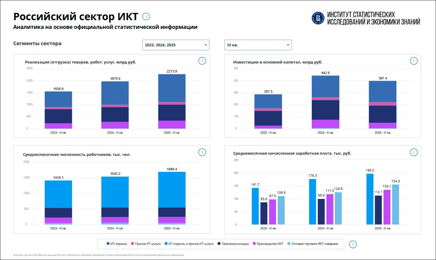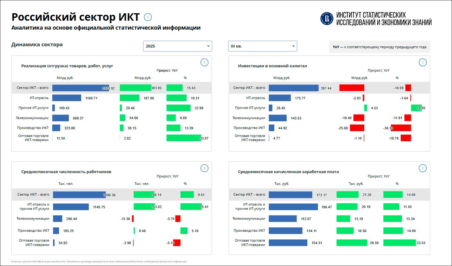 Институт статистических исследований и экономики знаний НИУ ВШЭ опубликовал отчёт о тенденциях развития сектора информационно-коммуникационных технологий (ИКТ) и его сегментов (IT-отрасли, телекоммуникаций, производства ИКТ-оборудования, оптовой торговли ИКТ-товарами) по итогам девяти месяцев 2025 года.