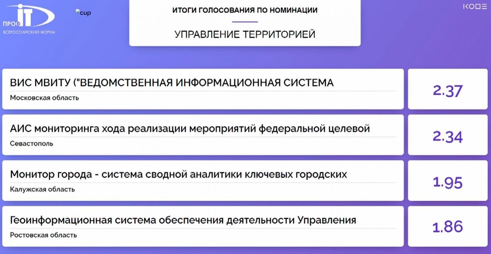 Четыре региона представили в финале свои проекты: Ростовская область – «Геоинформационная система обеспечения деятельности Управления торговли и бытового обслуживания города Ростова-на-Дону»; Московская область — Ведомственная информационная система «Мониторинг выдачи и исполнения технических условий»; Калужская область – «Монитор города – система сводной аналитики ключевых городских процессов»; Севастополь — Автоматизированная информационная система мониторинга хода реализации мероприятий федеральной целевой программы «Социально-экономическое развитие Республики Крым и г. Севастополя до 2022 года».
