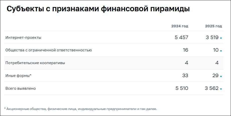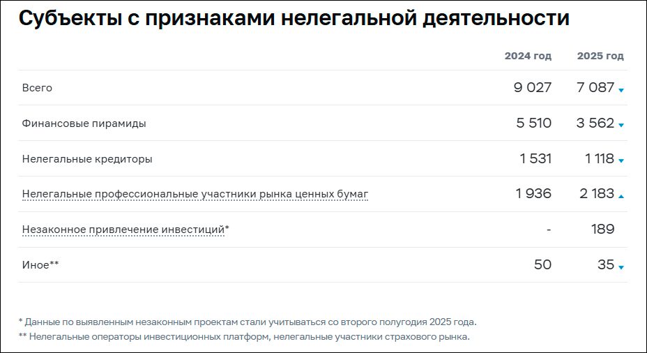 В 2025 году Банк России выявил более семи тысяч нелегальных участников финрынка; почти все финансовые пирамиды (3,6 тысячи) и псевдоброкеры (2,2 тысячи) действовали в Интернете, следует из отчёта Центробанка.