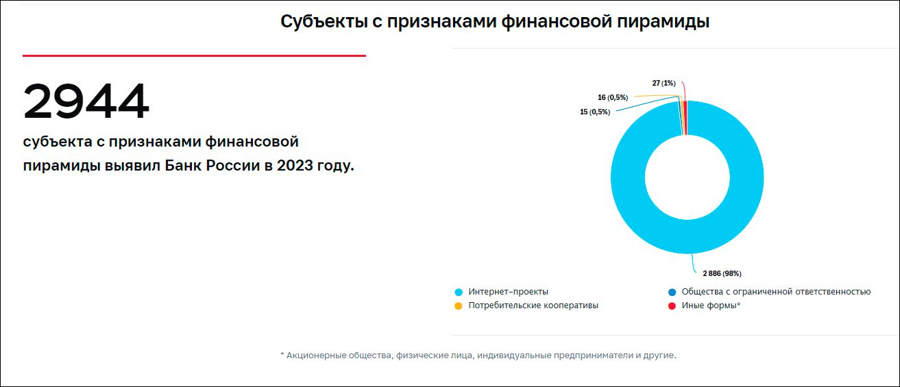 Всего за год ЦБ выявил 5735 субъектов (компаний, проектов, индивидуальных предпринимателей и других) по признакам нелегальной деятельности, в том числе организации финансовых пирамид. Это на 15,5% больше, чем годом ранее, но «срок жизни» таких проектов стал короче, а «средний чек» уменьшился, говорится в документе. Конкретно финансовых пирамид по сравнению с 2022 годом было выявлено больше на 46%.