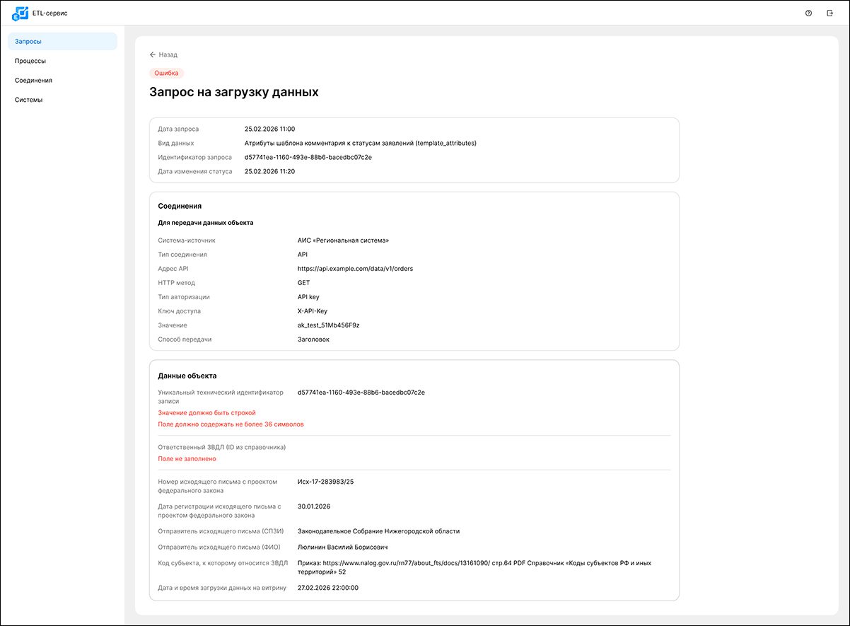 Отдельная задача — управление качеством данных. На старте работы ETL-сервиса ошибки в поступающих данных неизбежны. Интерфейс сервиса даёт полную, сквозную видимость: где именно завис пакет, в каком компоненте сбой и кто конкретно должен исправить ошибочное поле.