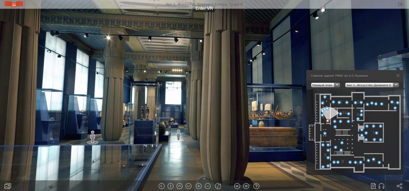 В обоих режимах доступны функции перемещения между пятью зданиями, внутри каждого – между этажами, залами и точками обзора в зале, функции вызова аудиосопровождения к залу и экспонату.