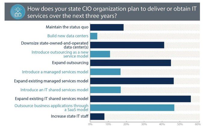 Штаты будут сокращать масштаб государственных IT-активов, таких, как центры обработки данных, и будут шире использовать аутсорсинг инфраструктуры и SaaS «софт как услуга». Кроме того, IT -директора видят, что их организации принимают на себя ответственность за закупку этих управляемых услуг.