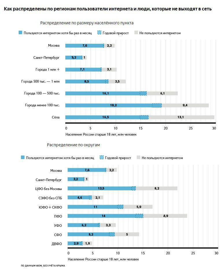 В 2015 году аудитория Интернета в городах-миллионниках почти перестала увеличиваться. Резерв для дальнейшего роста в крупных городах — только люди старше 45 лет. В городах с населением меньше 500 тысяч человек и сёлах число пользователей продолжает расти, и там ещё есть несколько миллионов людей молодого и среднего возраста, которые пока не пользуются Интернетом, говорится в исследовании.