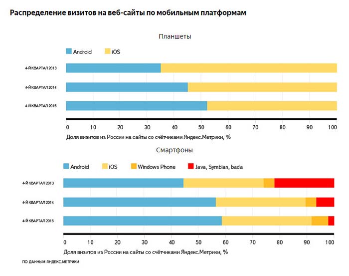 За 2015 год доля Android на смартфонах ещё больше увеличилась за счёт старых устройств на Java, Symbian и bada. Также за их счёт выросли смартфоны Windows Phone. Доля iOS среди мобильных телефонов осталась прежней, а на планшетах iOS в конце 2015 года впервые уступила Android.