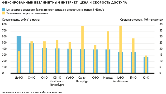 Средняя по российским городам и провайдерам ставка самого дешёвого тарифа без ограничения трафика с заявленной скоростью скачивания не менее 3 Мбит/с в марте 2016 года составляла 404 рубля.