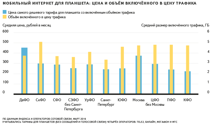 Что касается мобильного Интернета, то в среднем по России Интернет для планшета с включённым ежемесячным трафиком стоит около 280 рублей в месяц за пакет в 4,5 Гб. Дороже всего мобильный доступ на Дальнем Востоке и в Москве. Дешевле всего — в Крыму, Поволжье и на Северо-Западе. Стоимость в самых дорогих и самых дешёвых городах (не учитывая города без оптоволоконного подключения) различается в 3-4 раза.