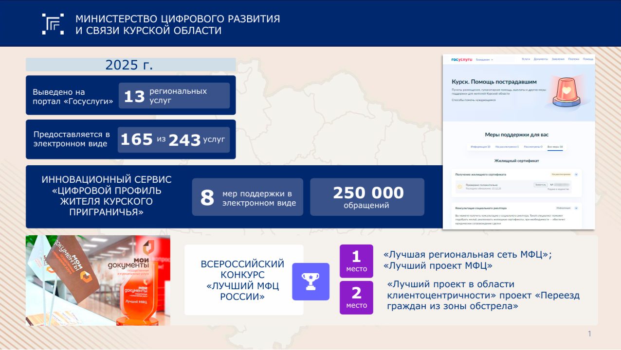 Помимо предоставления государственных услуг онлайн продолжает развиваться Многофункциональный центр региона. В 2025 году курский МФЦ стал победителем Всероссийского конкурса «Лучший многофункциональный центр России» в двух номинациях: