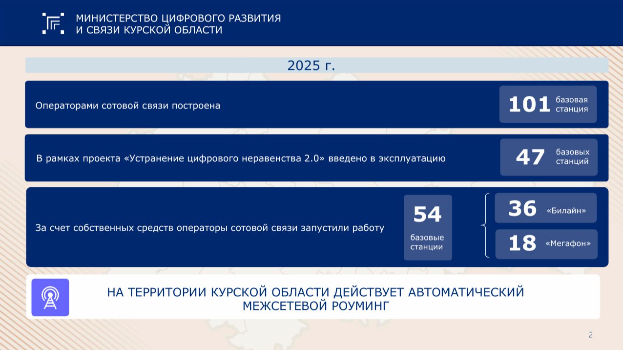 В 2025 году на территории Курской области операторами сотовой связи установлена 101 базовая станция подвижной радиотелефонной связи. Из них 54 операторы сотовой связи (18 — ПАО «Мегафон» и 36 — ПАО «Вымпелком») установили за счёт собственных средств, а 47 были введены в эксплуатацию в рамках проекта «УЦН 2.0» за счёт средств федерального бюджета.