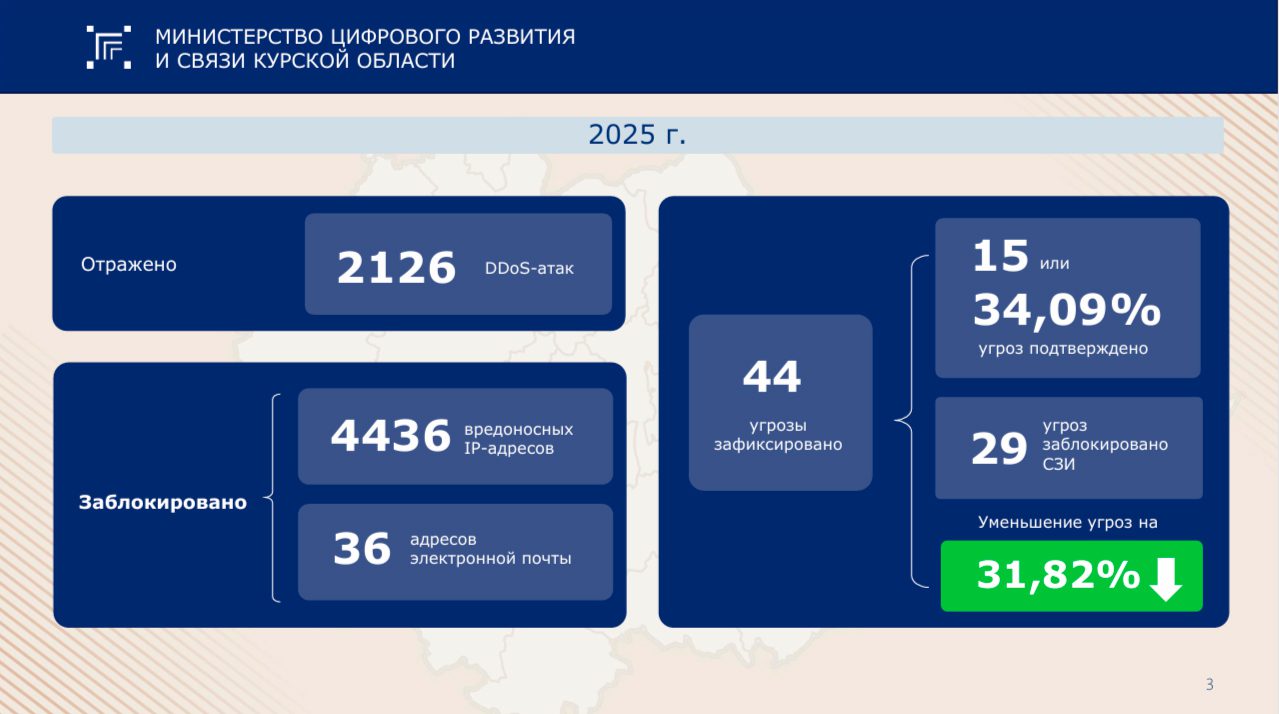 За 2025 год в автоматическом режиме было отражено 2126 DDoS-атак на инфраструктуру правительства Курской области. Дополнительно сотрудники Минцифры Курской области, ОКУ «Центр электронного взаимодействия» во взаимодействии с регуляторами и органами в сфере безопасности ограничивают доступ к вредоносным ресурсам и адресам, занося соответствующие IP-адреса в «чёрные списки» на сетевом оборудовании. В 2025 году было заблокировано 4436 вредоносных IP-адресов и 36 адресов электронной почты.